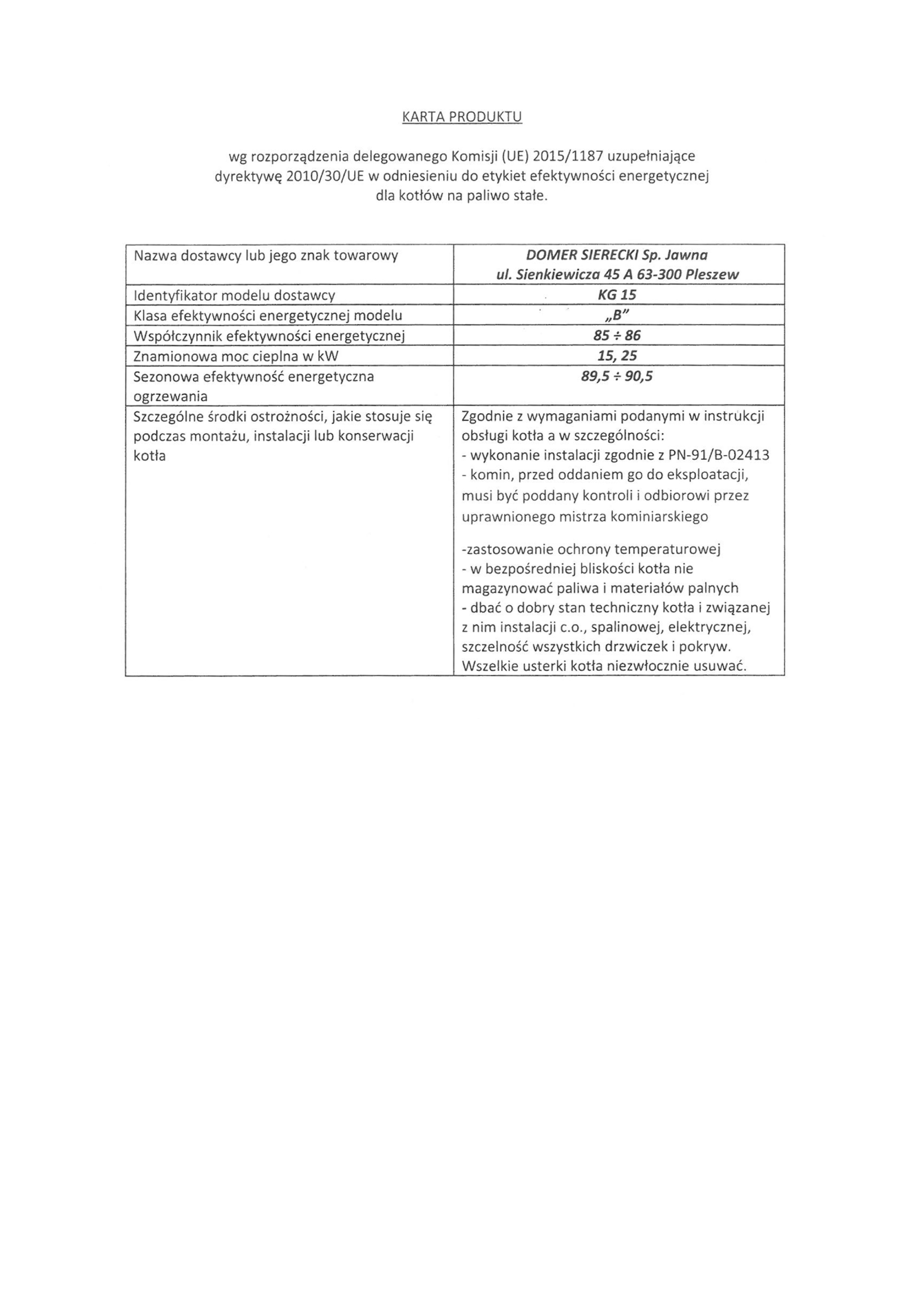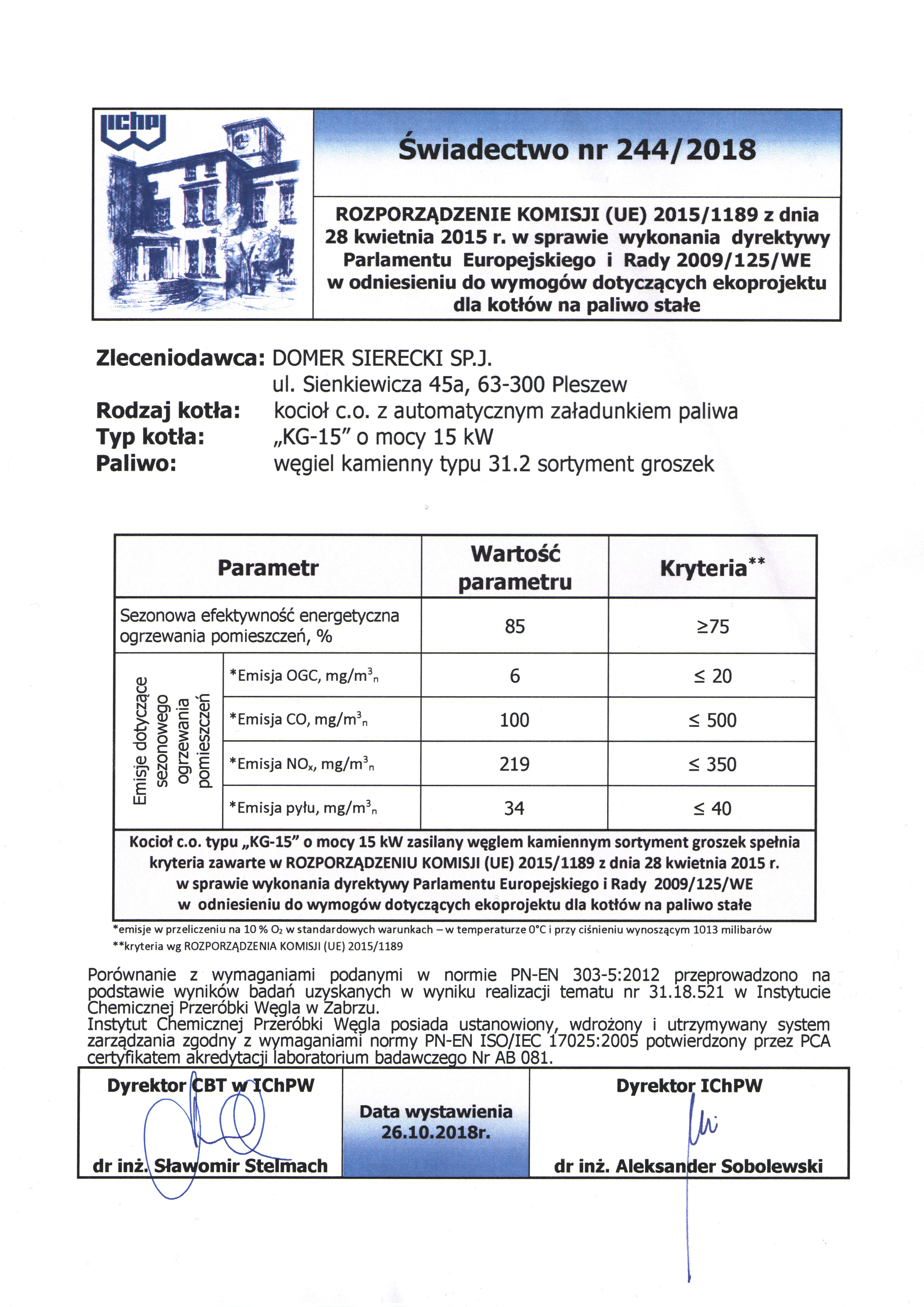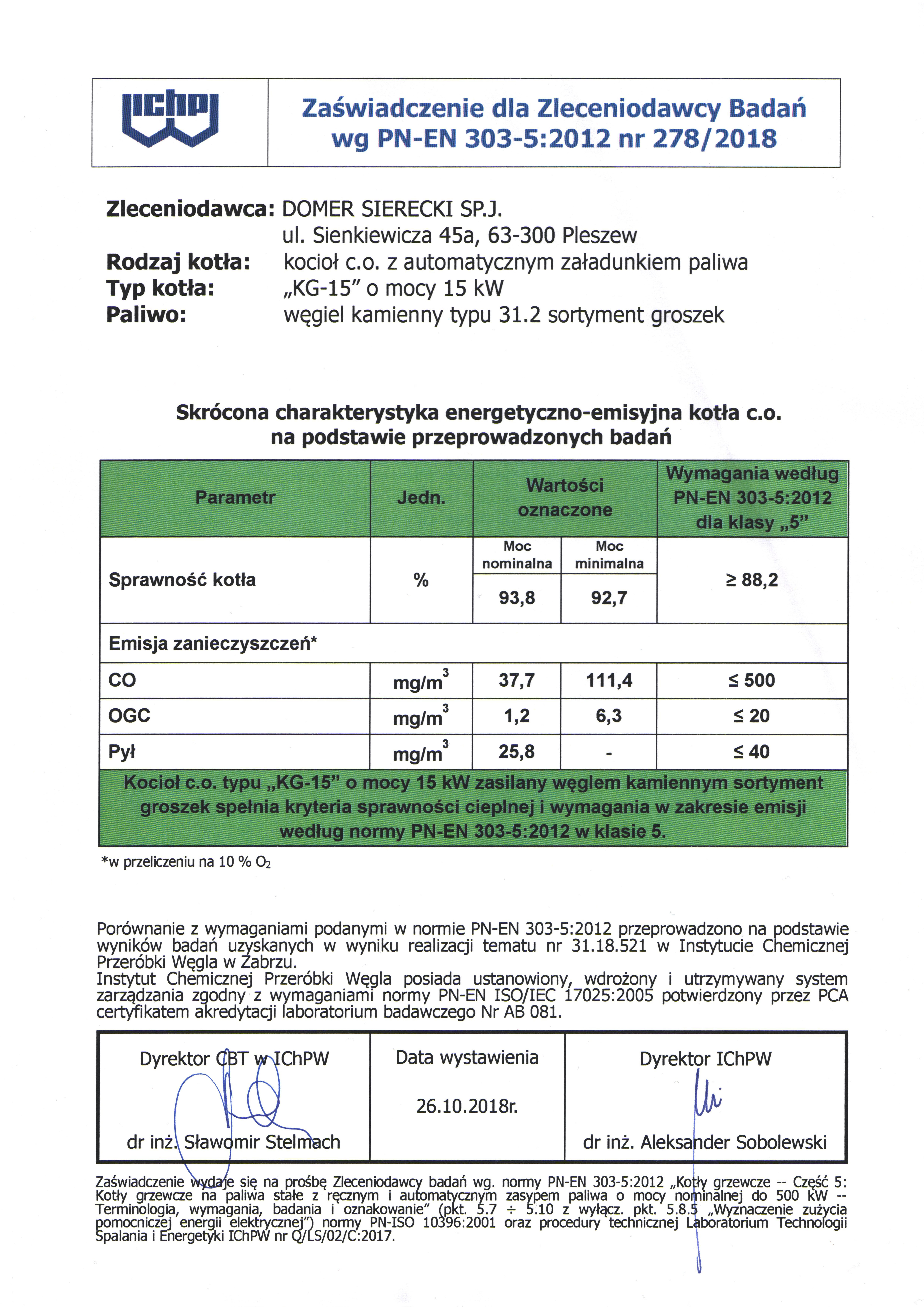 Nowoczesny kocioł grzewczy KG 15kW - 5 klasy spełnia wymogi normy PN-EN 303-5:2012 oraz ECODESIGN (Ekoprojekt). Konstrukcja kotła pozwala na ograniczenie szkodliwych spalin do atmosfery (CO, NOx, OGC) oraz pyłów.
